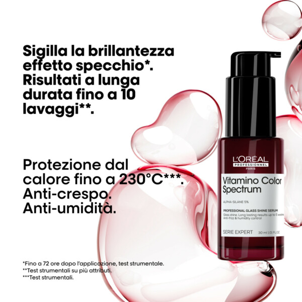 L’Oréal Professionnel Vitamino Color Spectrum Glass Shine Serum, enriched with 5% Alpha-silane, seals mirror-like shine with long-lasting results for up to 10 washes.