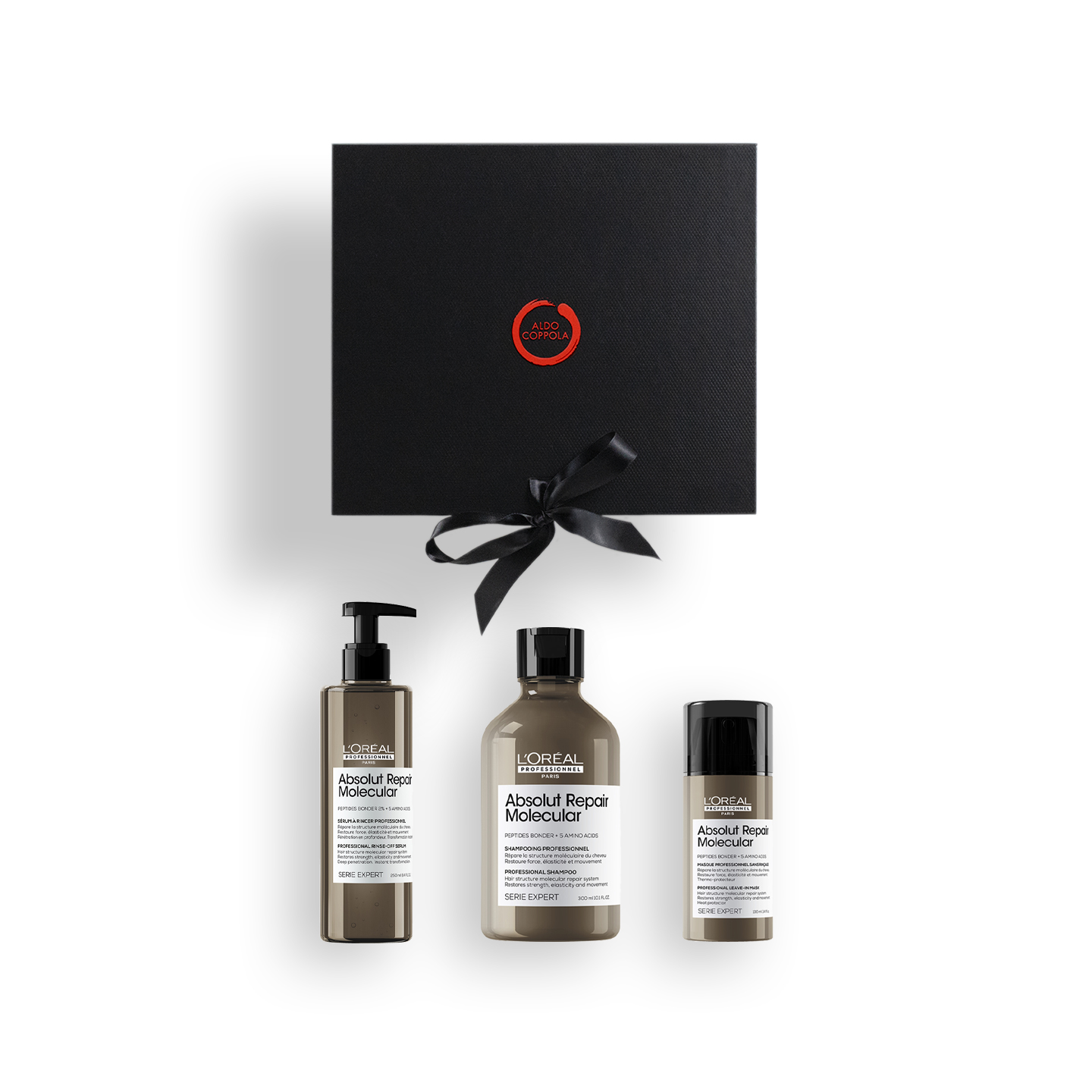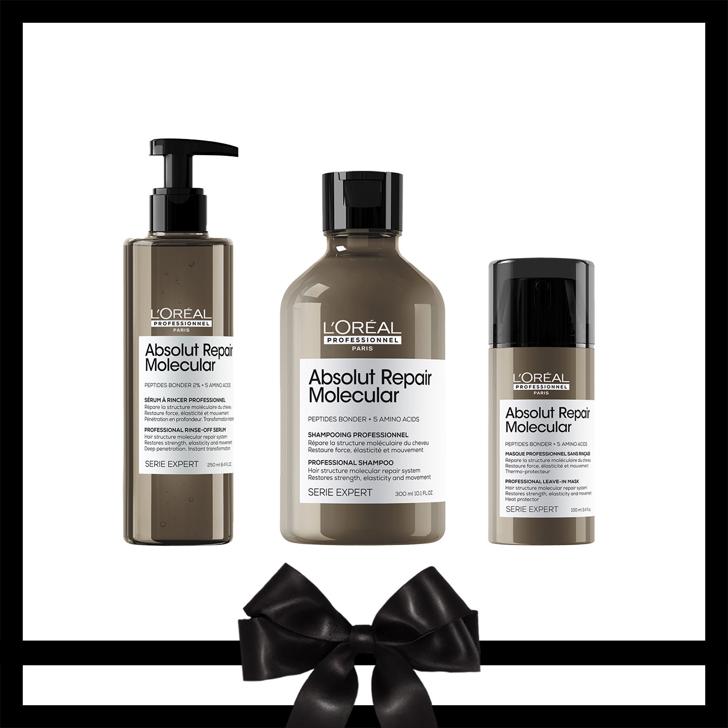 L’Oreal Professionnel Absolut Repair Molecular Beauty Kit, composto da Shampoo, Conditioner e crema Leave-in, offre una ricostruzione completa della struttura molecolare del capello.
