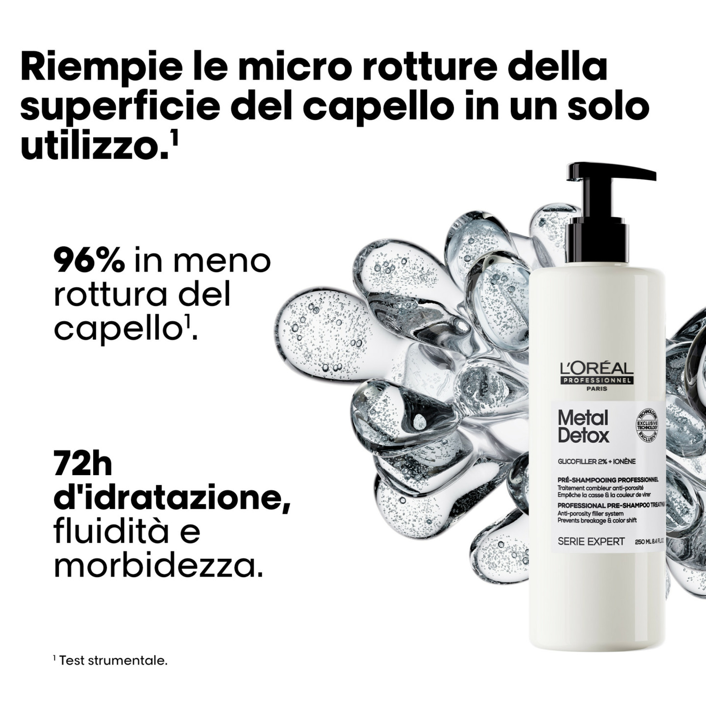 L’Oréal Professionnel Metal Detox Trattamento Professionale Pre-Shampoo riempie le micro rotture e rinforza il capello prevendo l’eccessivo assorbimento di acqua.
