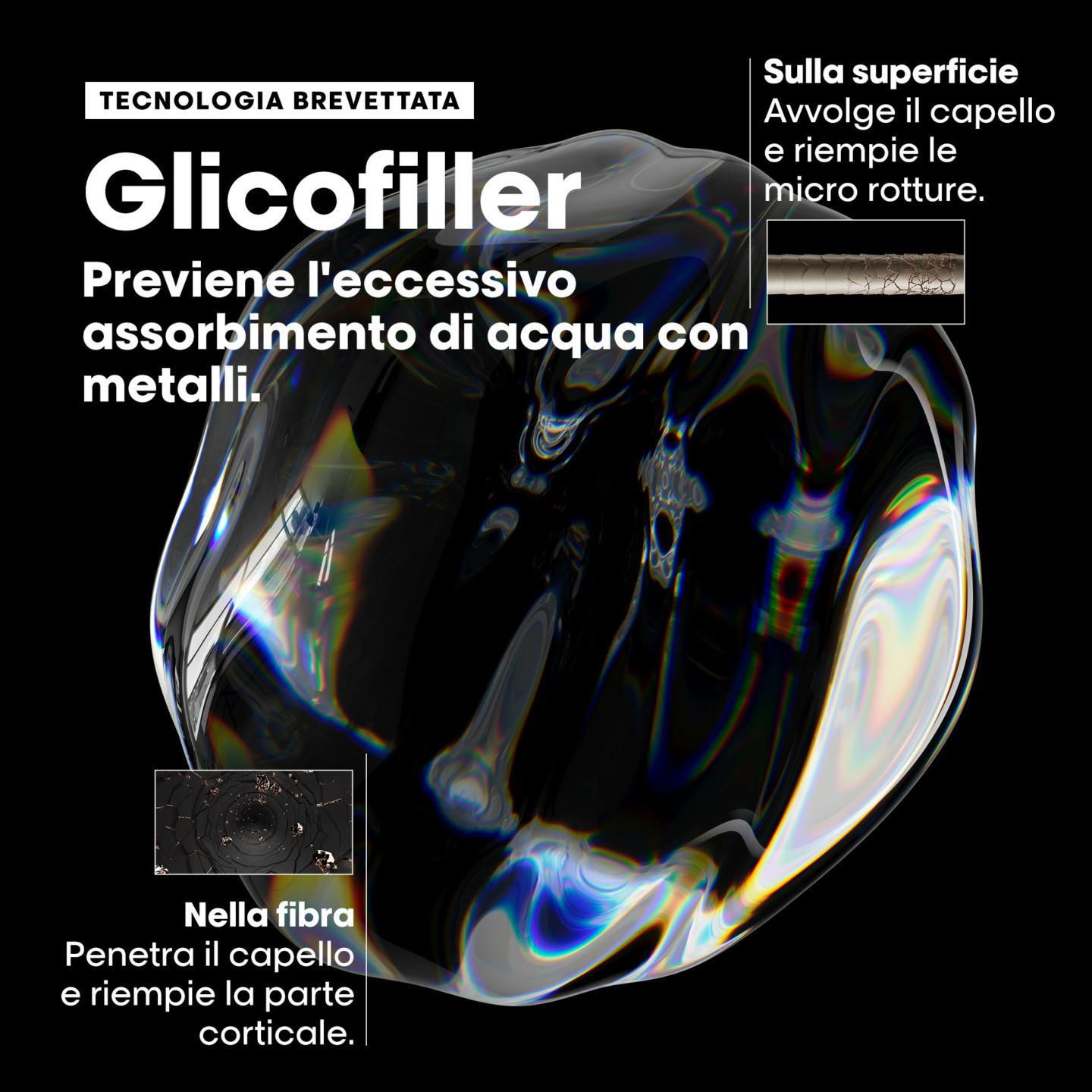 La sua tecnologia brevettata con Glicofiller agisce su due livelli: sulla superficie avvolge il capello, nella fibra penetra il capello e riempie la parte corticale.