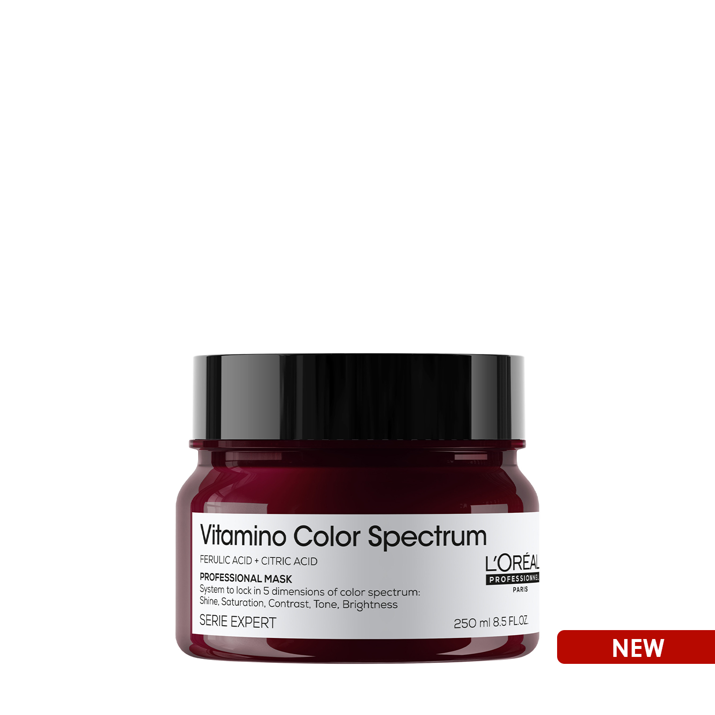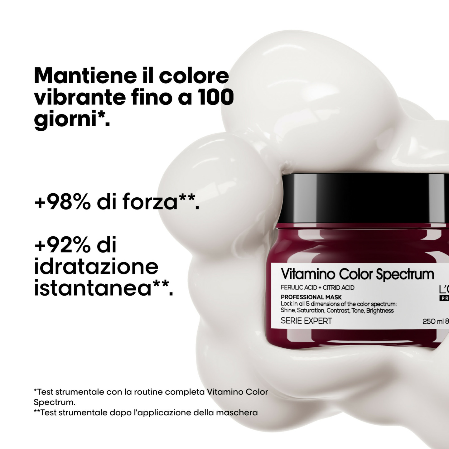 L’Oréal Professionnel Vitamino Color Spectrum Maschera per capelli colorati, formulata con Acido Ferulico + Acido Citrico, aiuta a fissare i pigmenti di colore nella fibra capillare per mantenere il colore del primo giorno, vibrante fino a 100 giorni