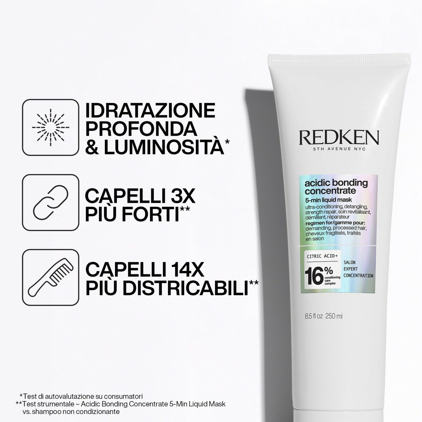 Formulato con il 16% di Conditioning Care Complex, con un’alta concentrazione di agenti cationici, oli condizionanti ed Acido Citrico come ingrediente star. I risultati: